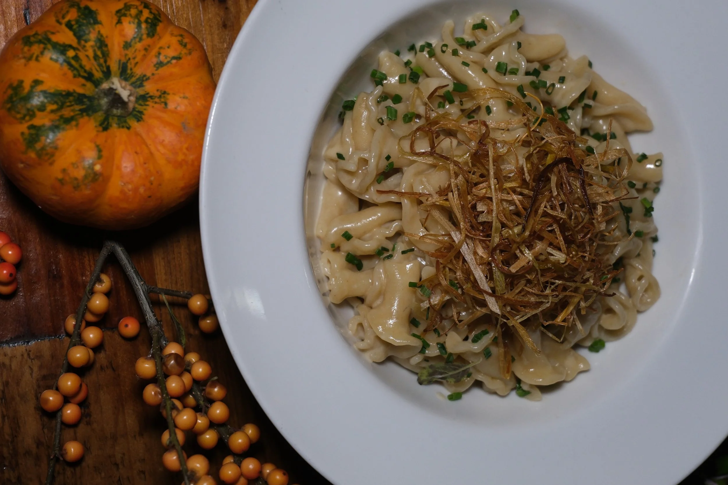 Gigli Pasta (from Soda Club!) – with truffle cream sauce, crispy leeks (contains allium, gluten)